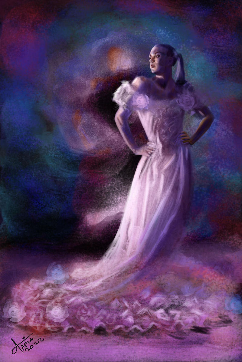 Esta obra captura la esencia de la sofisticación y la gracia a través de una figura femenina vestida con un elegante vestido blanco adornado con delicados detalles florales. Su postura firme y confiada transmite una sensación de majestuosidad, mientras que el fondo vibrante y oscuro crea un hermoso contraste que acentúa su presencia. La fusión de colores y texturas añade profundidad y misterio, invitando al espectador a interpretar su historia.