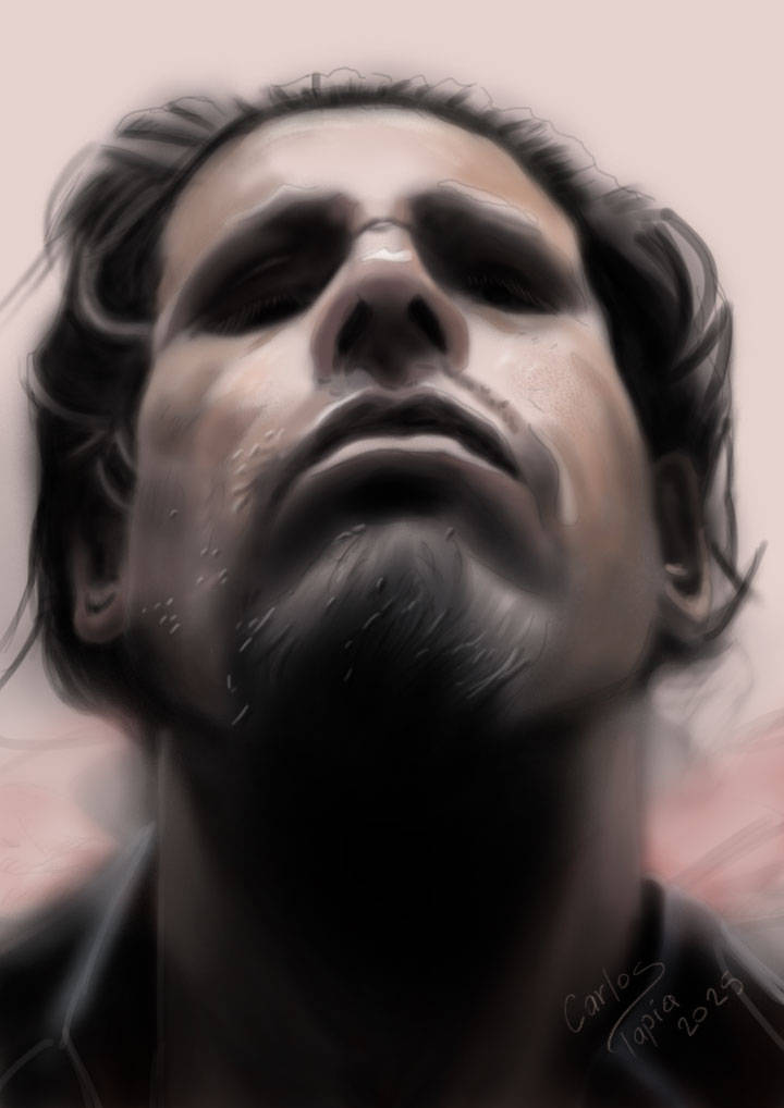 Esta obra digital, firmada por Carlos Tapia en 2025, presenta un retrato cargado de carácter y profundidad emocional. La figura, vestida con una chaqueta oscura y enmarcada por un cabello desordenado, transmite una energía introspectiva, casi melancólica. El uso de sombras y luces está cuidadosamente equilibrado, creando una atmósfera envolvente que acentúa los rasgos del rostro y da volumen a la composición. La técnica digital empleada en Photoshop logra una textura pictórica que recuerda al óleo, pero con la precisión y versatilidad del medio moderno. El fondo neutro permite que el protagonista se imponga con fuerza, mientras que la expresión facial sugiere una historia no contada, abierta a la interpretación del espectador. Es una pieza que combina dominio técnico con sensibilidad artística, reflejando la madurez creativa del autor.