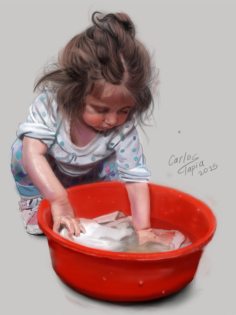 En Manos pequeñas, tareas grandes, Carlos Tapia captura un instante íntimo y cotidiano con una mirada cálida y honesta. La imagen muestra a una niña arrodillada frente a una tina roja, concentrada en lavar ropa con ambas manos sumergidas en agua jabonosa. Su blusa blanca con lunares azules y pantalones coloridos contrastan con el entorno, evocando una escena vibrante y llena de vida. La obra celebra el aprendizaje a través de la experiencia, donde el juego y la responsabilidad se entrelazan. No hay dramatismo ni idealización: solo una escena sincera que honra el valor de los pequeños gestos. La niña no solo lava ropa, sino que participa en el tejido invisible de la vida familiar, aprendiendo con cada burbuja que estalla entre sus dedos. Con esta pieza, Carlos nos invita a mirar con nuevos ojos lo cotidiano, reconociendo que incluso las tareas más simples pueden ser grandes cuando se hacen con dedicación y curiosidad.