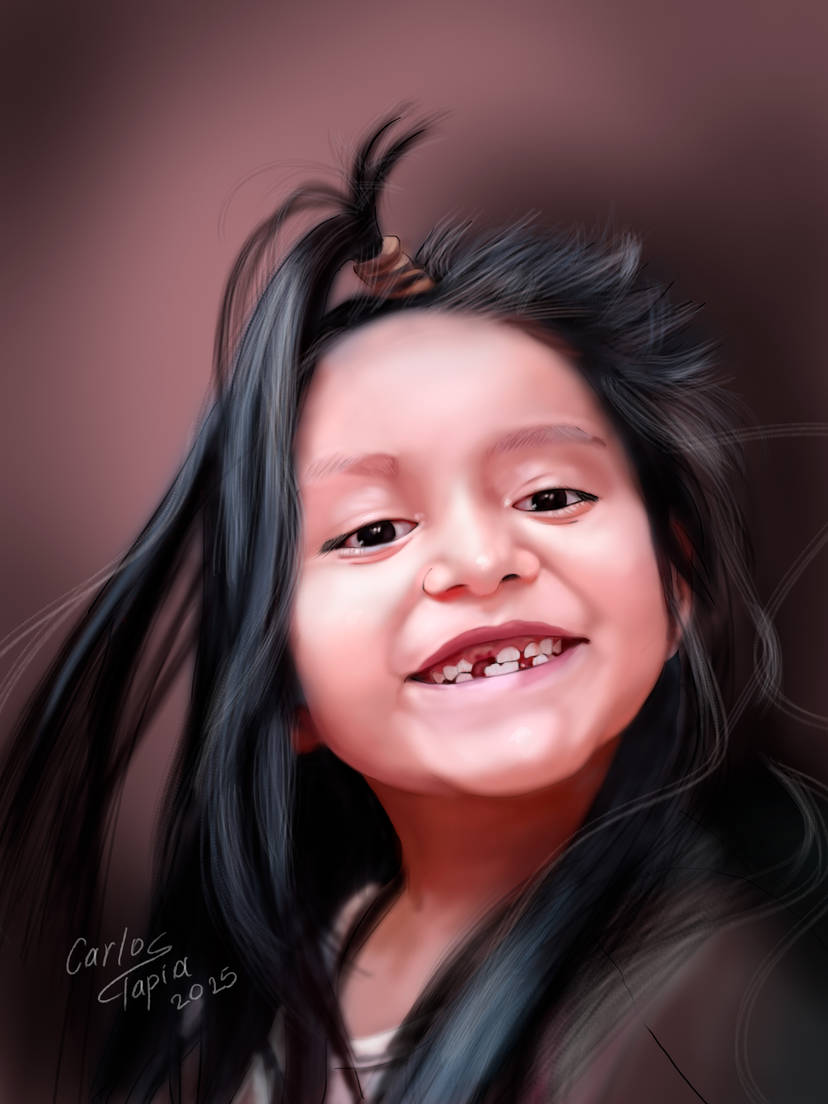 "Infancia en flor" es un retrato digital que celebra la alegría espontánea y luminosa de la niñez. La figura central, una niña sonriente con cabello largo recogido en un pequeño moño, transmite una energía vibrante y auténtica. Su expresión abierta, marcada por la ausencia de dientes frontales, revela la belleza de lo imperfecto y el encanto del crecimiento. La obra, realizada en Photoshop y firmada por Carlos Tapia en 2025, destaca por su tratamiento delicado de la luz y el color. El fondo cálido y difuminado envuelve al personaje en una atmósfera suave, mientras los trazos digitales aportan movimiento y textura. Cada detalle —desde los mechones sueltos hasta la mirada chispeante— construye una imagen que florece con ternura y vitalidad. Es una pieza que invita a detenerse en lo cotidiano, reconociendo que la infancia no solo se vive: también se contempla, se recuerda y se celebra.